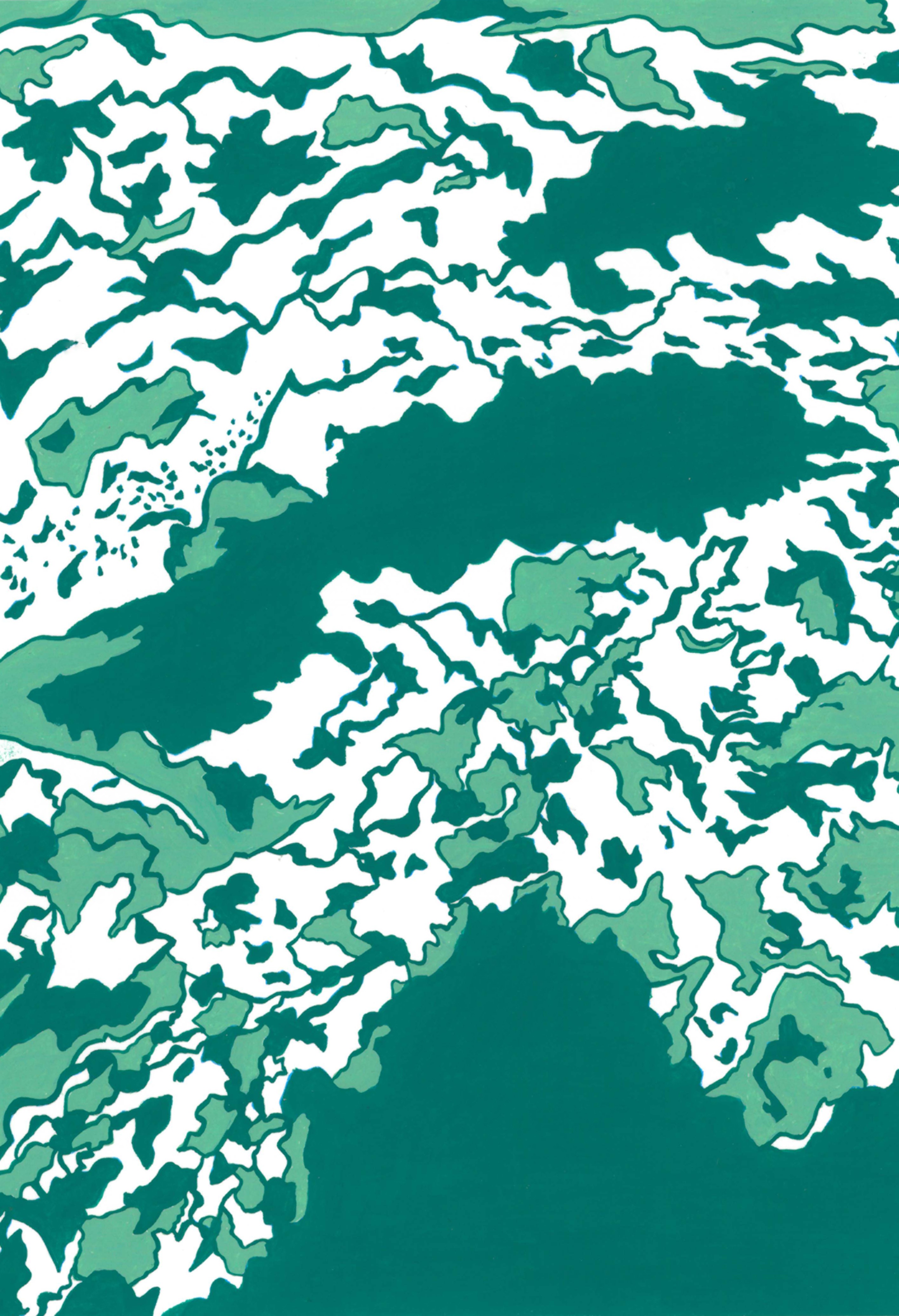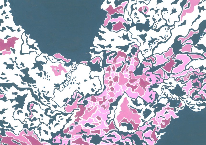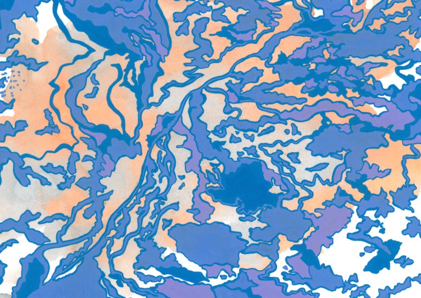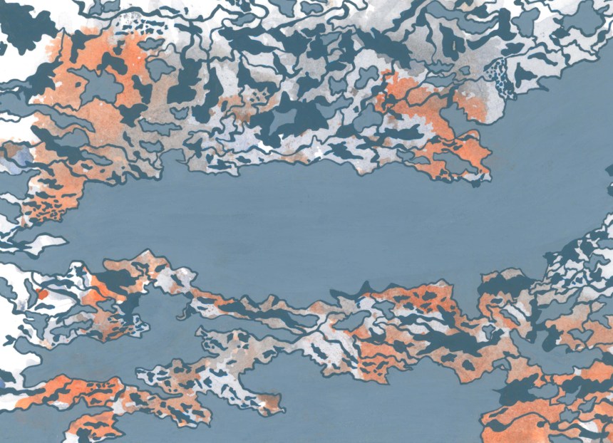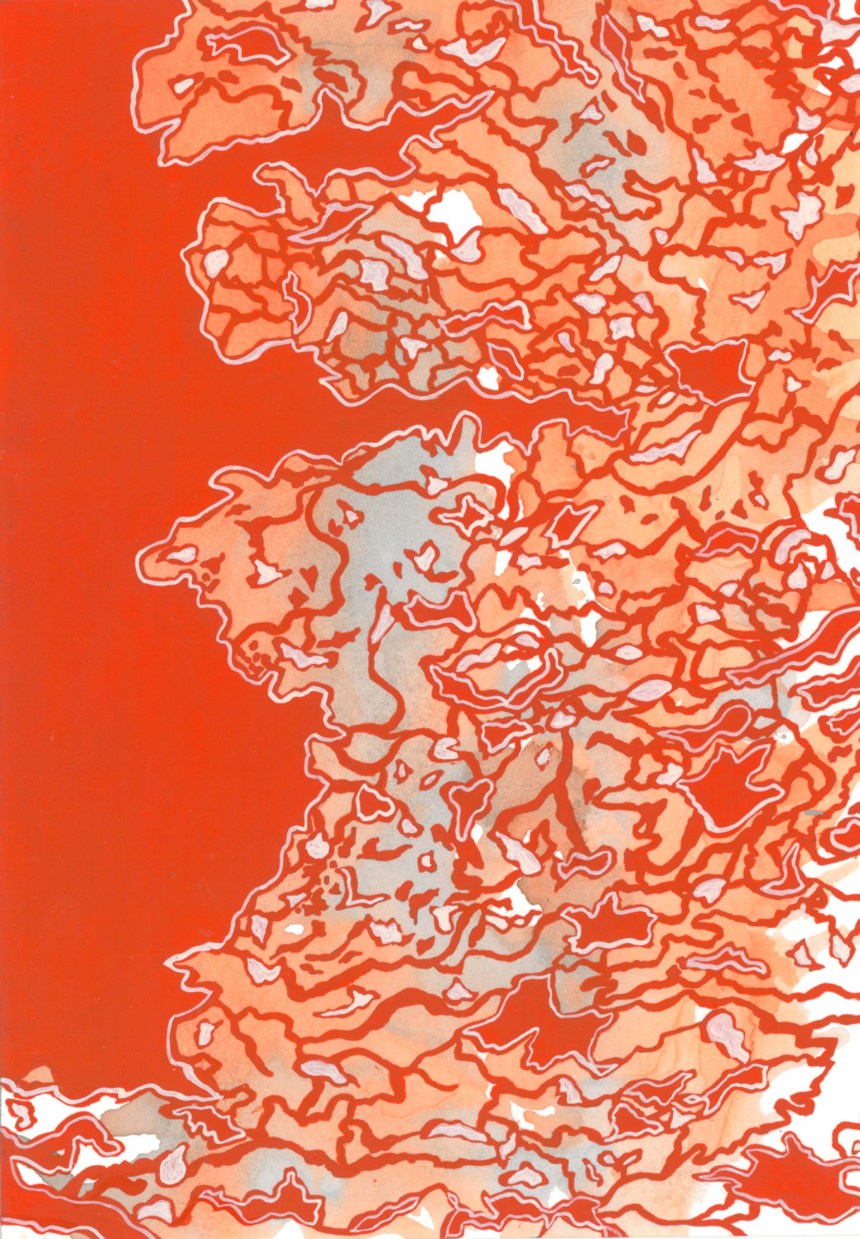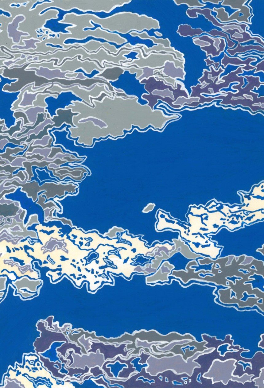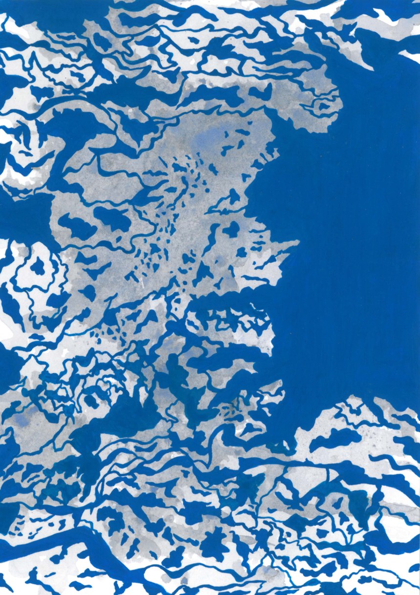 Hard Freeze In November 2014, the Mississippi froze (hard), and I made eight maps of the ice patterns on the river. The paintings below were done on hot press paper with ink, gouache, and black tea. 2014, ink, gouache, and tea on paper Related